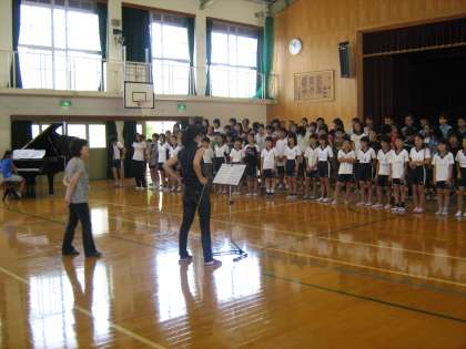 はじめはカエルの歌で発声練習をし,歌の練習にうつりました。
