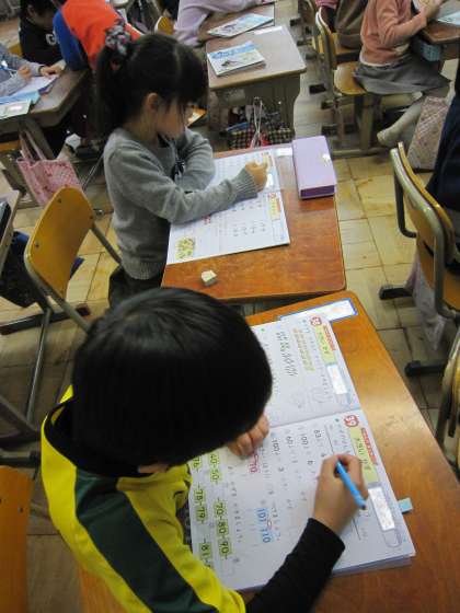 1年生は,算数のドリルを使って,ひきざん・大きいかずなどの問題を解いていました。