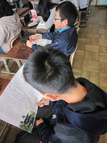 6年2組では,「京都探訪」で回ったところのパンフレット作りに取り組んでいました。