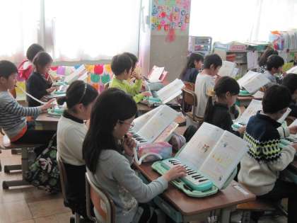 2年2組では,音楽の時間のはじめに鍵盤ハーモニカの演奏に取り組んでいます。