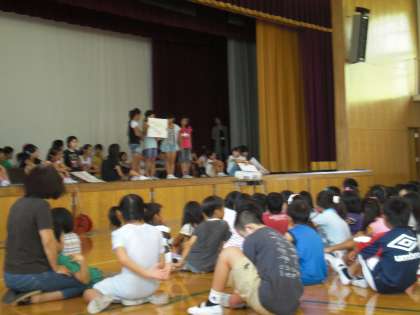 続いて,メロディー委員会が中心となり,「ビリーブ」を全校児童が体育館いっぱいに響かせました。ピアノ伴奏もメロディ委員の児童が担い,暗譜してしっかり伴奏ができていました。その後,メロディー委員会による三択クイズや集会委員会による○×クイズで楽しみました。