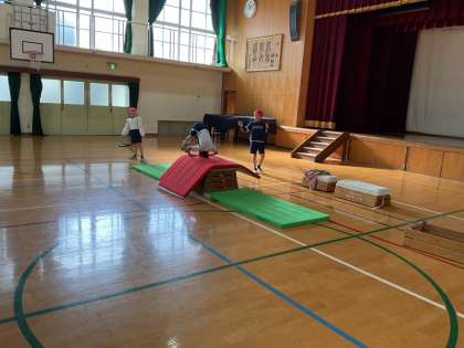 3年生で初めてかかえこみ跳びや台上前転に挑戦しています。初めは怖がっている様子も見られましたがいろんな場で練習をすることで「できるようになった!」と喜ぶ子も増えてきました。