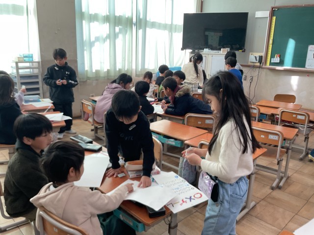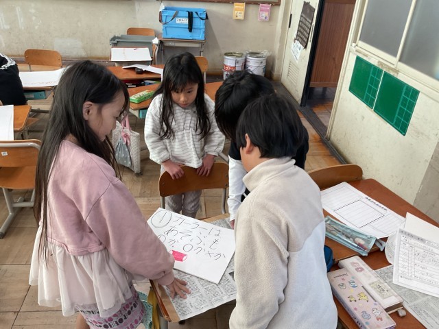 「すてきな まち」を伝えよう、というテーマで、グループごとに分かれて、1月30日(金)に1年生へ向けて発表する準備を進めています。チームリーダーを中心に、じっくりと話し合いながら活動することができています。