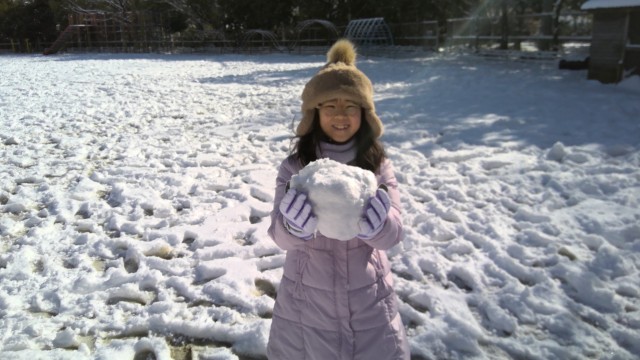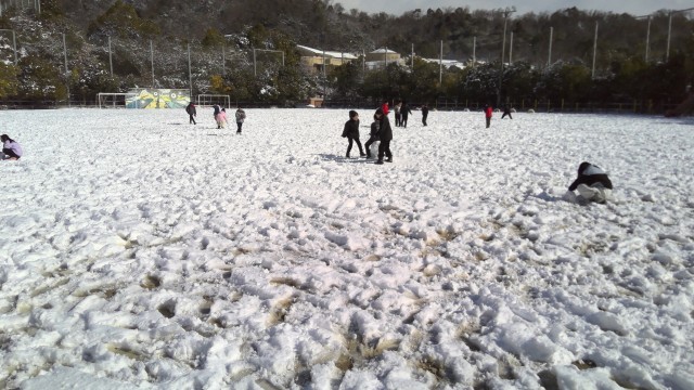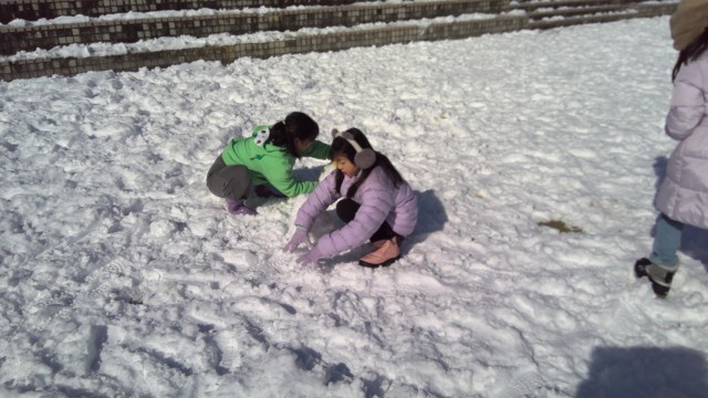 校庭にやわらかい雪が積もり、4年生は少しの時間、雪遊びを楽しみました。