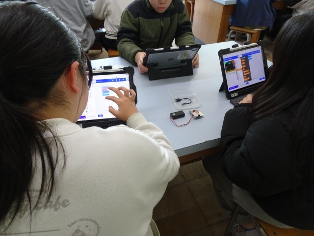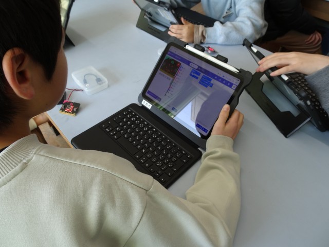 理科の学習では、発電と電気の利用という単元のまとめとして、「電気を無駄なく使うプログラムを作ろう」というめあてでマイクロビットとプログラミングを使い、「暗かったら電気がつく」というようなプログラムつくりにチャレンジしています。