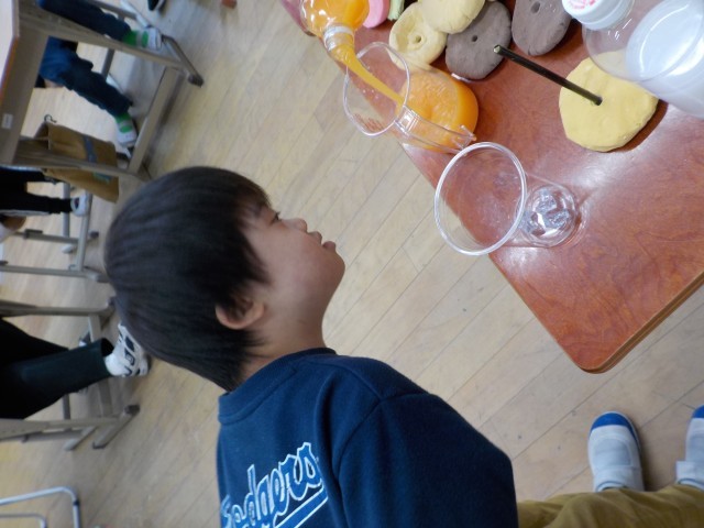 かさや長さの学習を生かして、ジュースをいれたりポテトを作ったりしています。