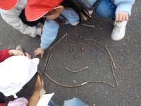 図工科の学習で木の枝や石、どんぐりを拾い集めならべてみました。どんな形ができるか...