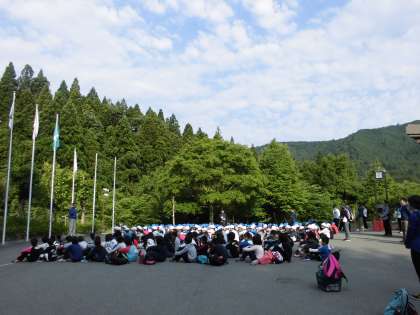 今朝は、一緒に宿泊している西野小学校・唐橋小学校と合同の朝の集いです。