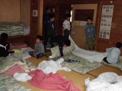自分たちの使った寝具や部屋の掃除、荷物の整理をしました。協力してやると、早くきれいになることを実感しています。