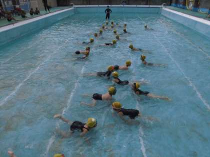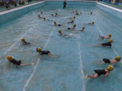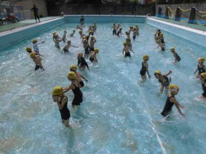プールに入るときの注意と,バディチェックの仕方をしっかりと学習しました。
