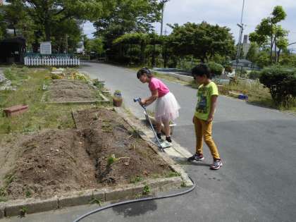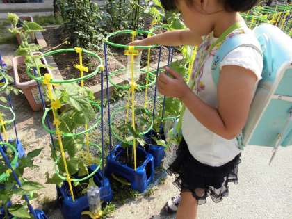 2年生の野菜が,日に日に大きくなってきています。収穫も始まっています。大事に水をやってる姿が素敵です。ひとり一人の植木鉢と,みんなの畑にサツマイモも植えています。