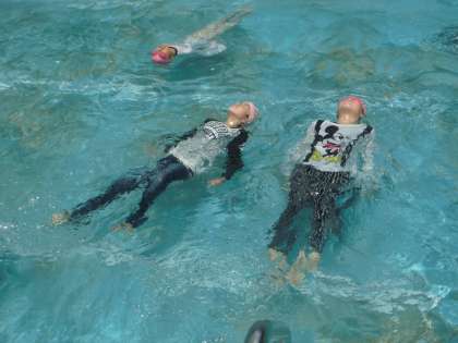 長ぞで・長ズボンで水に入り,歩いたり泳いだりしました。