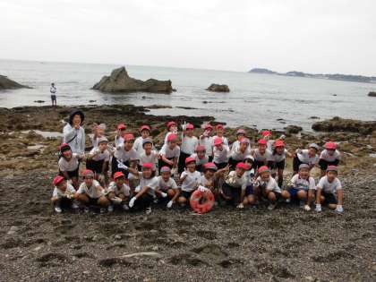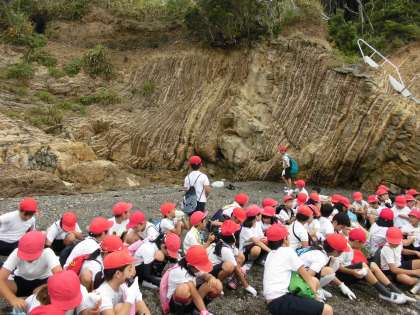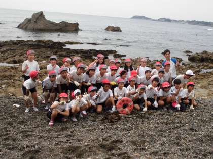みんなが楽しみにしていた磯観察です、今年は歩いて、10分くらいのところの野尻浜へ行きました。浜が見えると、歓声が上がりました。元気いっぱいのクラス写真です。地層のよく見える浜です。