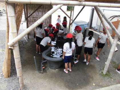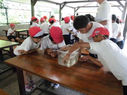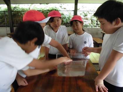 みさきの家の近くの海にすんでいる生き物を、実際にさわれるように、みさきの家の先生が用意してくださいました。どの人もどんどん触って、観察を楽しんでいました。