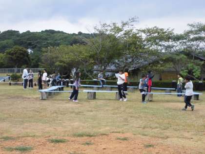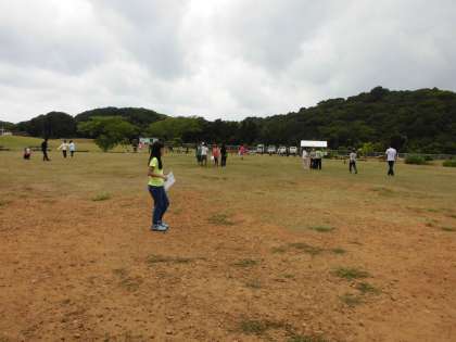夜のキャンプファイヤーに向けて,各班スタンツの練習をしました。広場のあちこちで,練習をしています。