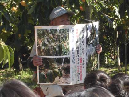 柿づくりの一年間の様子,今までにいろんな自然とたたかってきたこと,おいしい柿づくりのひみつなど,たくさんのお話を聞くことができました。