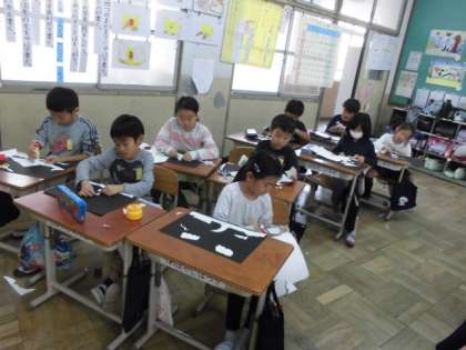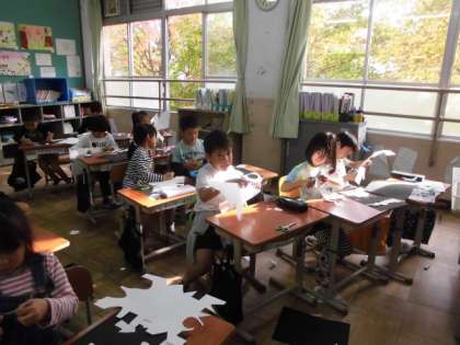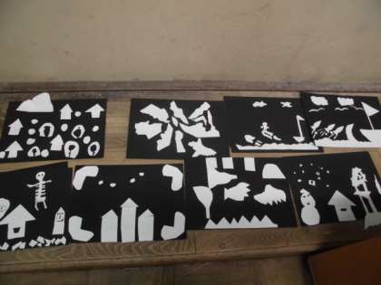 紙をはさみで自由に切り,黒い画用紙にはっていくといろんな形に見えてきました。