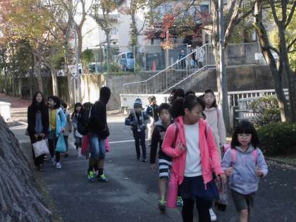 集団登校でしっかり並んで登校できている班が多いです。寒くなってきますが,これからも班長さんを中心にみんなで登校しましょう。