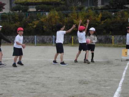 体育では,パスゲームをしています。
