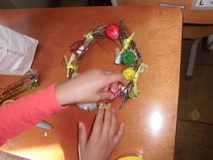 生活の学習で育てたあさがおのつるで,リースを作っています。