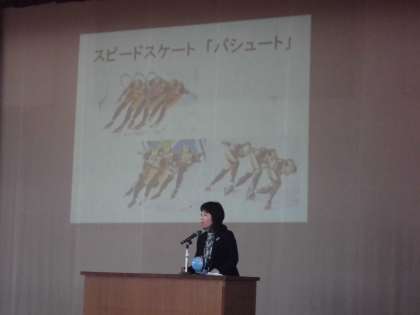 スケートの「パシュート」という種目の話をしました。日本の女子のチームは,3人が一人ひとりの力を合わせ,工夫し協力して,3倍以上の力を発揮している強いチームであることを紹介しました。