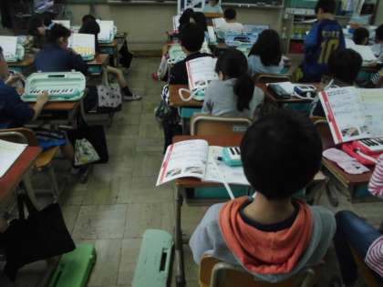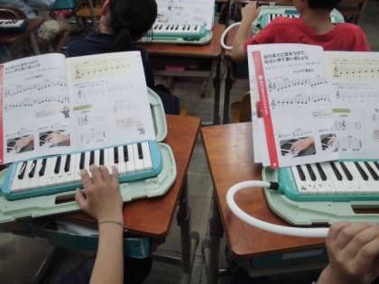 音楽の学習で鍵盤ハーモニカを使いました。「指くぐり」「指またぎ」という弾き方を練習しました。