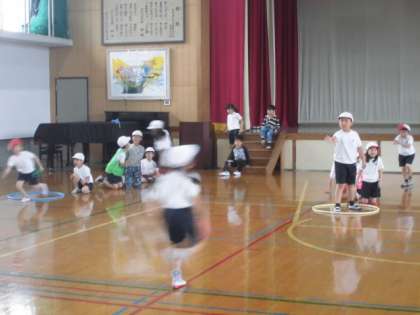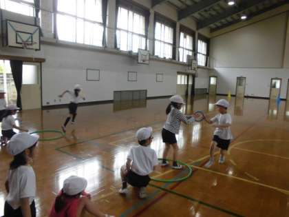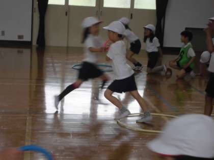体育の学習でリレー遊びをしています。チームで走る順番を変えたり,バトンの受け渡しに気をつけて落とさないようにしたりと工夫をしながら力いっぱい走っています。お天気が悪かったので今日は体育館での学習になりましたが,元気に楽しく学習しました。