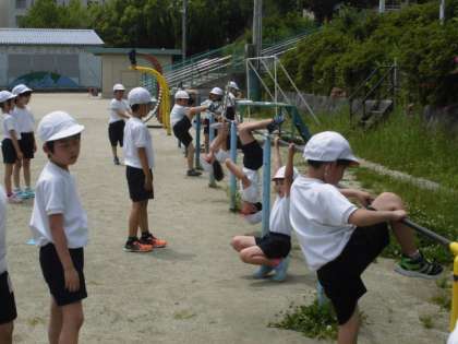体育の学習は鉄棒遊びをしています。こうもり・ふとんほし・足抜きまわり・逆上がりなど,様々な技に挑戦しています。友達同士で教え合ったり,できているか確認し合ったりしながら学習を進めています。手に豆ができてしまう子もいますが,休み時間にも鉄棒に挑戦するなど,熱心に活動しています。
