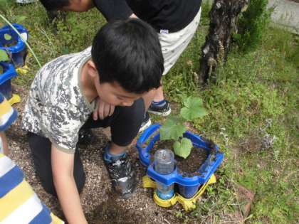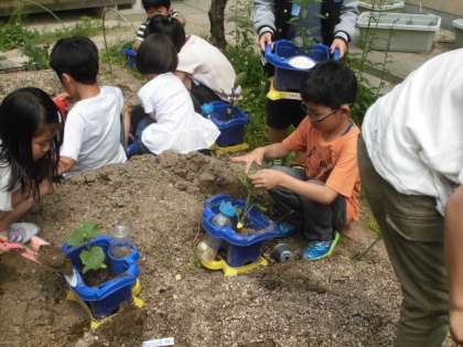 生活科の学習で野菜の苗を植えました。先週から植木鉢の準備をして,子どもたちはとても楽しみにしていました。ミニトマト・ピーマン・ナス・シシトウ・オクラ。自分で育ててみたい野菜を選び一人ひとり植木鉢に植えました。今は小さな苗ですが,子どもたちは収穫を楽しみにしているようです。これから毎日水やりをして大切にお世話をしていきます。また,学年園にはさつまいもとトウモロコシを植えて学年全体で育てていきます。