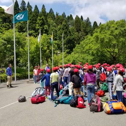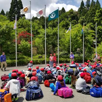 入所式の様子です。自分たちで作った旗をあげました。