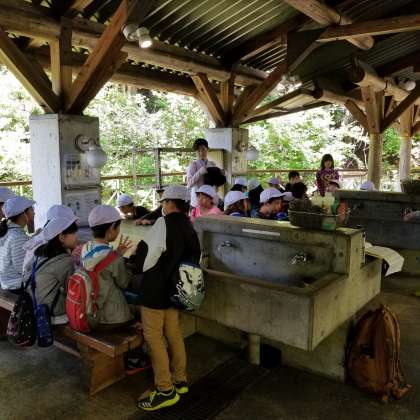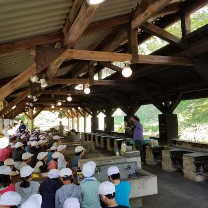 今から野外炊事です。鳥すき焼きをつくります。かまど係、おかず係、ごはん係、準備をがんばっています。