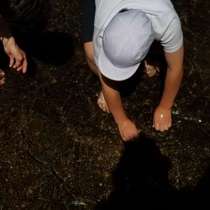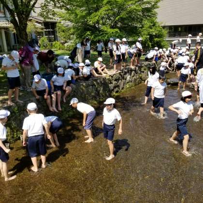 魚つかみが始まりました。きゃーきゃーと苦戦しています。