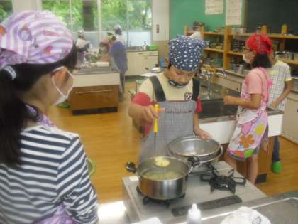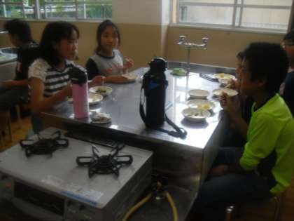 さてさてお味は? 「少しじゃがいもが固かったかな。でも,おいしい!!」との声。「ホウレンソウのお浸しは文句なし。」とのことでした。片付けも最後までしっかりやり遂げました。