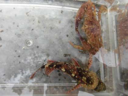 かご漁で,カサゴやヒトデ,カニ,大きなヤドカリなどが獲れました。