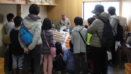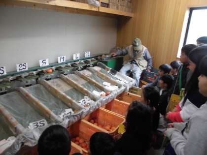 柿の重さを仕分けする機械が動く様子を見学することができました。