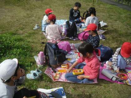 オリエンテーリングでたくさん歩いておなかがペコペコになったので,お弁当を食べました。仲良しグループで話をしながら,楽しいお昼の時間になりました。