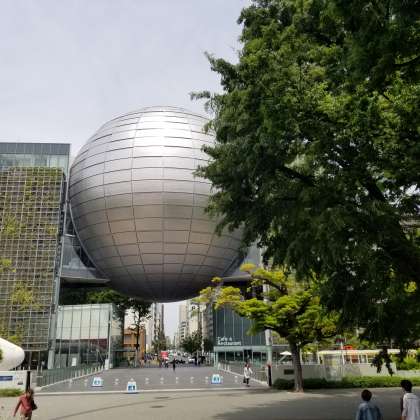 名古屋市科学館に着きました。木陰で昼食です。暑すぎず、気持ちのよい天気です。