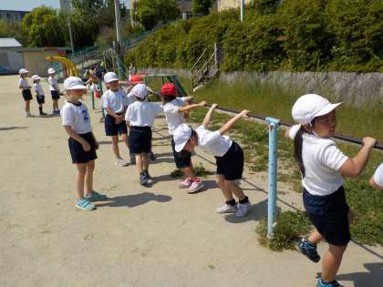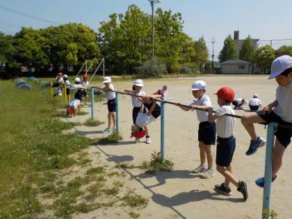 体育の学習は鉄棒遊びの学習に入りました。「地球まわり」や「こうもりふり」「さかあがり」など,新しい技に挑戦しています。手にまめができたり,鉄棒をかけるので,ひざの裏が痛くなったりしながらも,頑張って練習しています。技を練習しながら,しっかり親指をかけて鉄棒を握る,体重を両腕で支えることを身につけて,遊具の安全な使い方につなげていきます。手にたくさんのまめを作って帰ってきたら,「よく頑張っている証拠だね。頑張っているね。」とほめてあげてください。