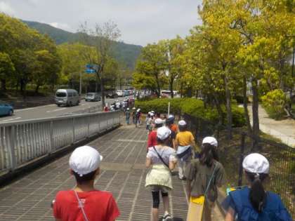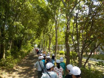 今日は社会科の授業で町探検をしました。学校のまわりを,1組2組交流つばさで探検しました。今まで行っていた場所でも,注意してまわりを見ると様々なことに気づいたようです。「木に看板がある」,「これ何の石なんやろ」など発見や疑問が出てきました。木の看板はその木の種類が書いてあったり,不思議に思った石が,新林校区30周年記念で作られたものだったりと様々なことを知れたまち探検だったと思います。