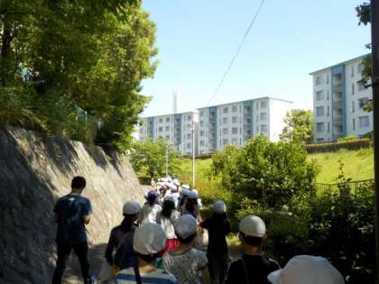 23日(木)の5,6時間目に校区たんけんを行いました。前回と違い学校から東の方角に向かいました。「家の近くやで」「友達の家の近く」「ドラッグストアがあるところー」など知っていることの発言も多く出ましたが,電信柱に町内の名前が書いてあること,街頭が京都市で万を超える数があるかもしれないことなど,今まで見てなかったところに目を向けることもできた校区たんけんでした。