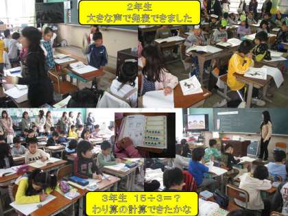 昨日に続き,今日は,つばさ・1・2・3年生の授業参観と懇談会を行いました。つばさ学級は小麦粉粘土や漢字の勉強をしました。1年生はひらがなの「こ」の字を丁寧に書きました。2年生は国語の「ふきのとう」をグループごとに大きな声で発表しました。3年生は算数のわり算について学習しました。みんな一生懸命でした。ご参加の保護者の方々ありがとうございました。