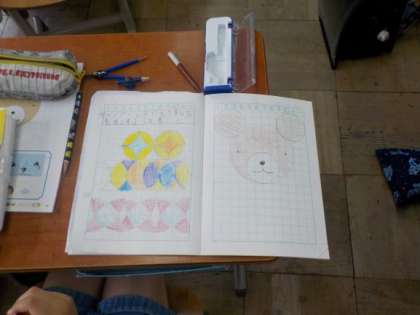 コンパスを使って教科書にある模様を描く学習を行いました。みんな「わからない」と言いつつも投げ出すことなく挑戦していました。コンパスの針を刺す位置がなかなか見つからないことがありましたが,円の中心を見つけ,模様ができた時にはすごくうれしそうに「見て!」と笑顔で言ってました。