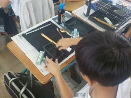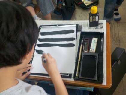 3年生の書写で,「はじめての毛筆」の学習を行いました。習字セットの中の道具の名前や準備の仕方を1つ1つ確認しながら,進めました。心を整えながら墨をする姿勢に意欲の高さを感じました。半紙に筆で初めて書いた感触に満足気な笑顔を見せてくれる児童が多かったです。