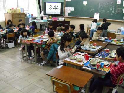 4月22日 給食がはじまって今日で9日目です。1年生も給食に慣れ,配膳もスムーズにできるようになりました。教室に行くと「おいしい」「おかわりしました」と元気な声で応えてくれました。