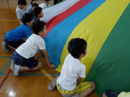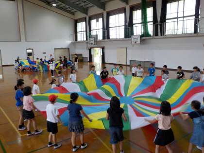 つばさ学級との交流を行いました。まず,みんなで自己紹介をして,去年,運動会でやったバルーンを一緒にして楽しく過ごしました。