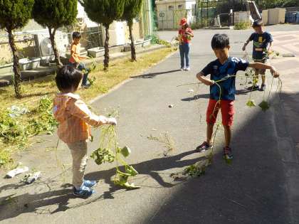 収穫した後はさつまいものつるを使って遊んだり,もっと深く掘って取り残しがないか確認したりしました。