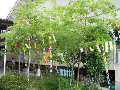 つばさ学級の子どもたちが玄関前の笹に七夕飾りをつけました。中間休みに遊んでいる子どもたちに短冊を渡し,願い事を書いて笹につけました。みんなの願いが叶うといいですね。