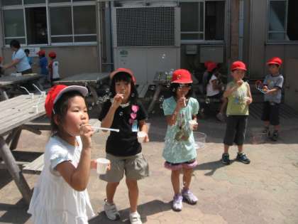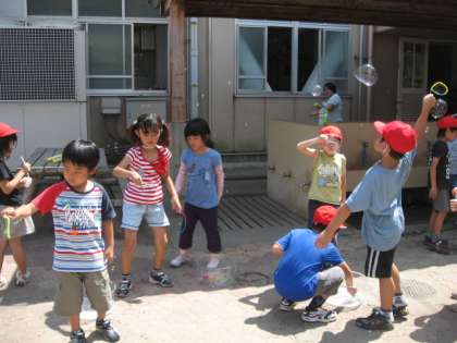 生活の学習で,シャボン玉遊びをしました。ストローでふいてとばしたり,大きなシャボン玉をつくったりして楽しみました。