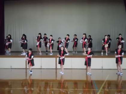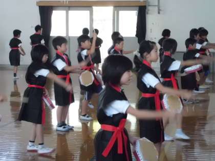 4年生は運動会で沖縄民舞の「遊び庭(あしびな)」を踊ります。今日は本番の衣装と太鼓を持って踊りました。
