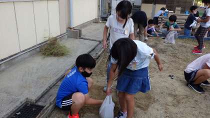 重さの学習では,袋の中に砂を入れ,1kgぴったりを目指しました。1kgの見本と比べ,班で相談しながら取り組んでいました。